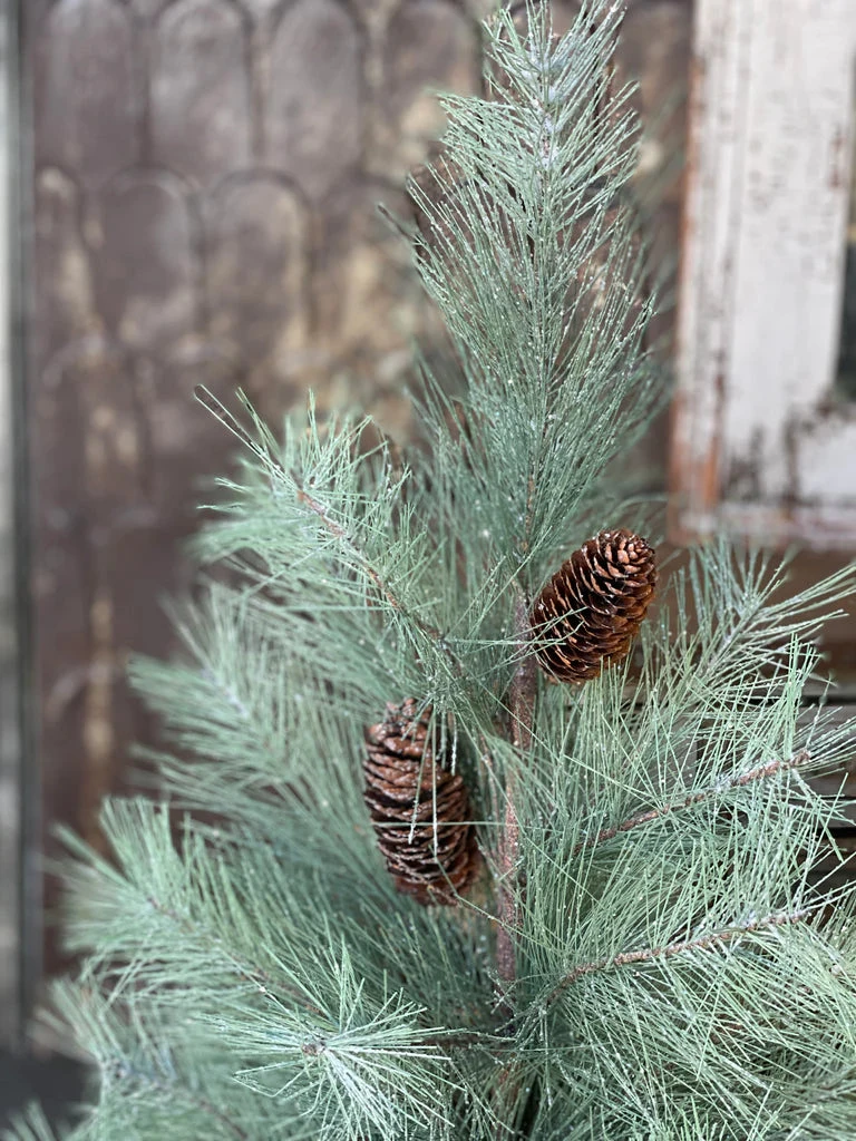 Cool toned needles shimmer and shine thanks to a dusting of glitter and snow. Natural pine cones add a touch of charm. Has a weighted burlap wrapped base.