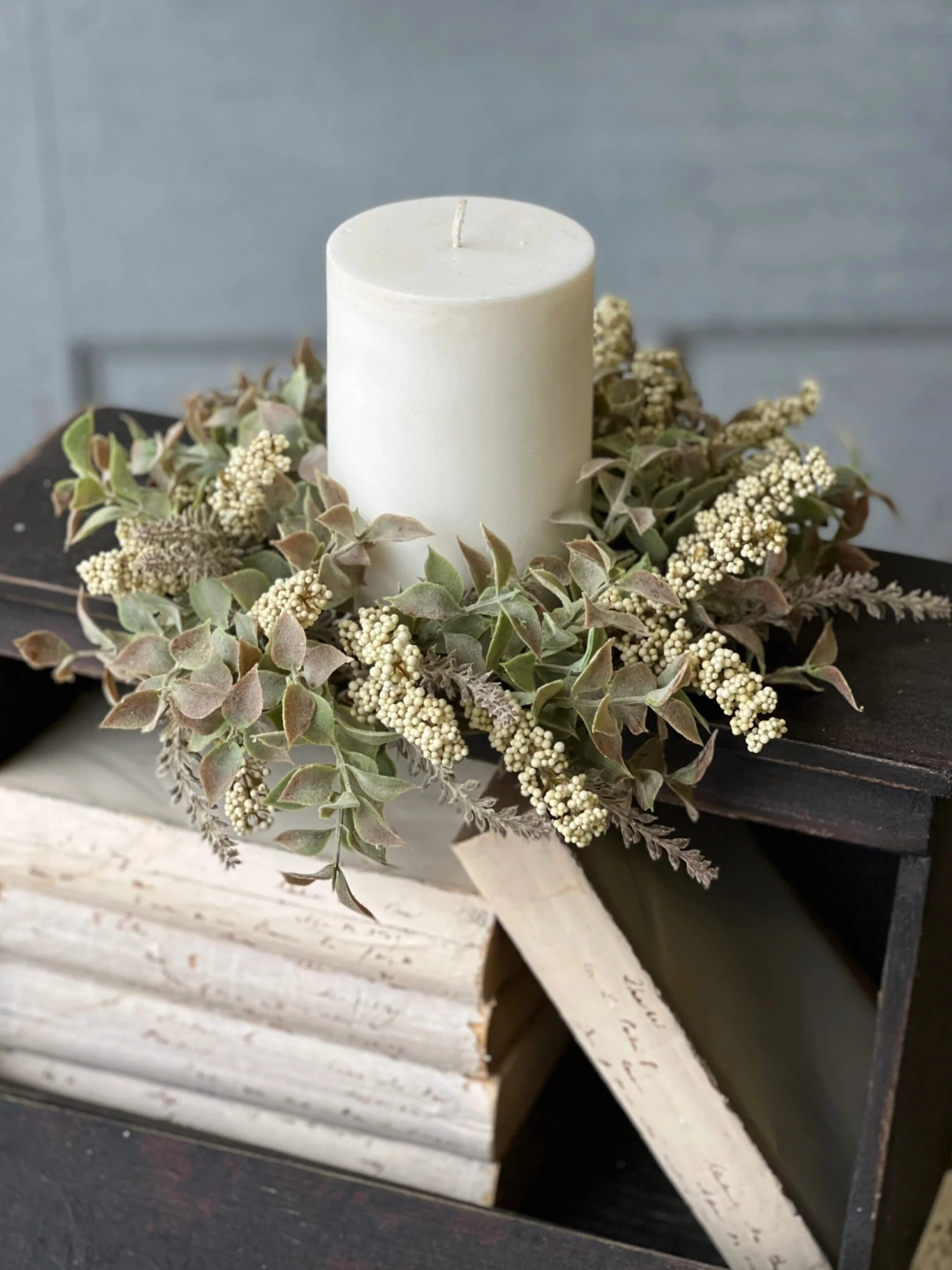 A collectionwith a crisp and cool feel made up of spires of bubble berries and lavender-like shoots tucked into leaves with a felted effect.