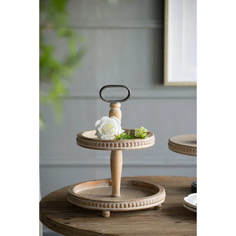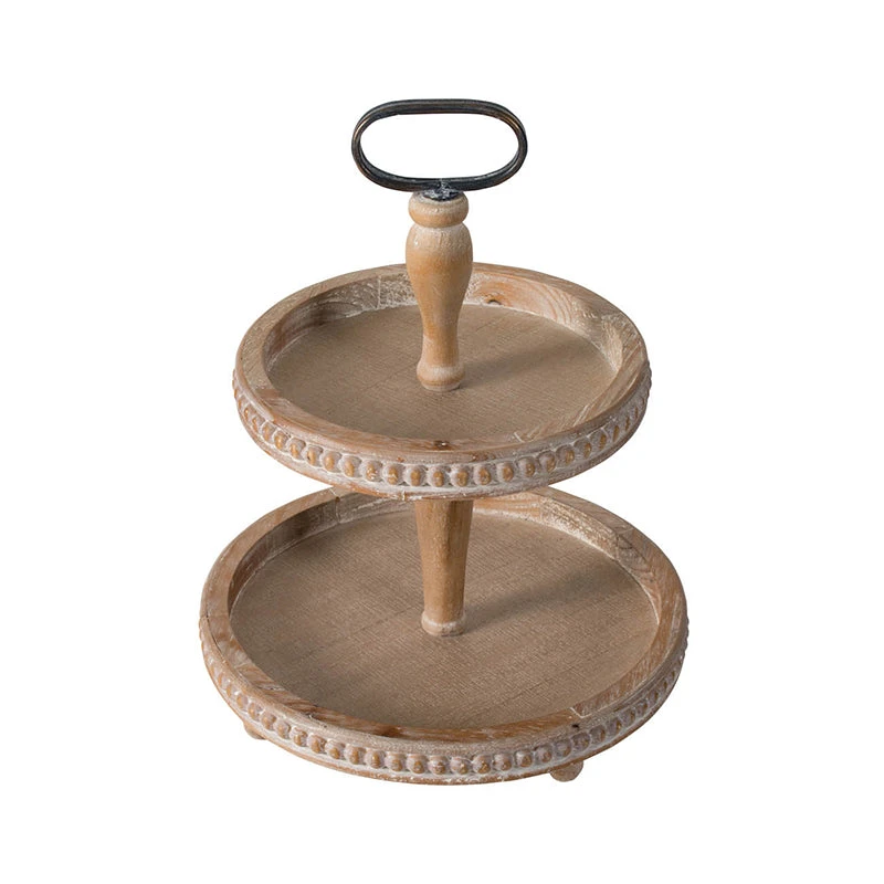 This 2 tiered tray takes the classic form of a pastry tower and comes detailed with a wood bead trim. A metal handle at the top completes the design, which displays mementos and decor alike. The multiple tiers of this piece is sure to diversify your decor with its elevated look.