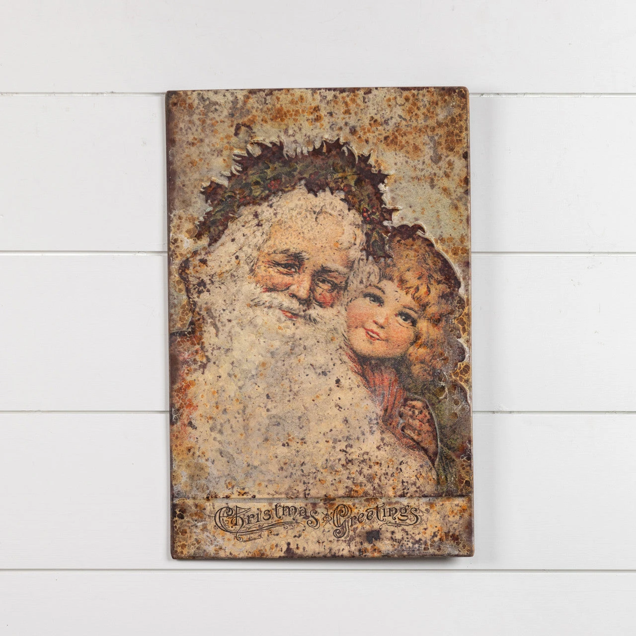 “Christmas Greetings” Santa & Girl Distressed Sign (Pick Up Only)