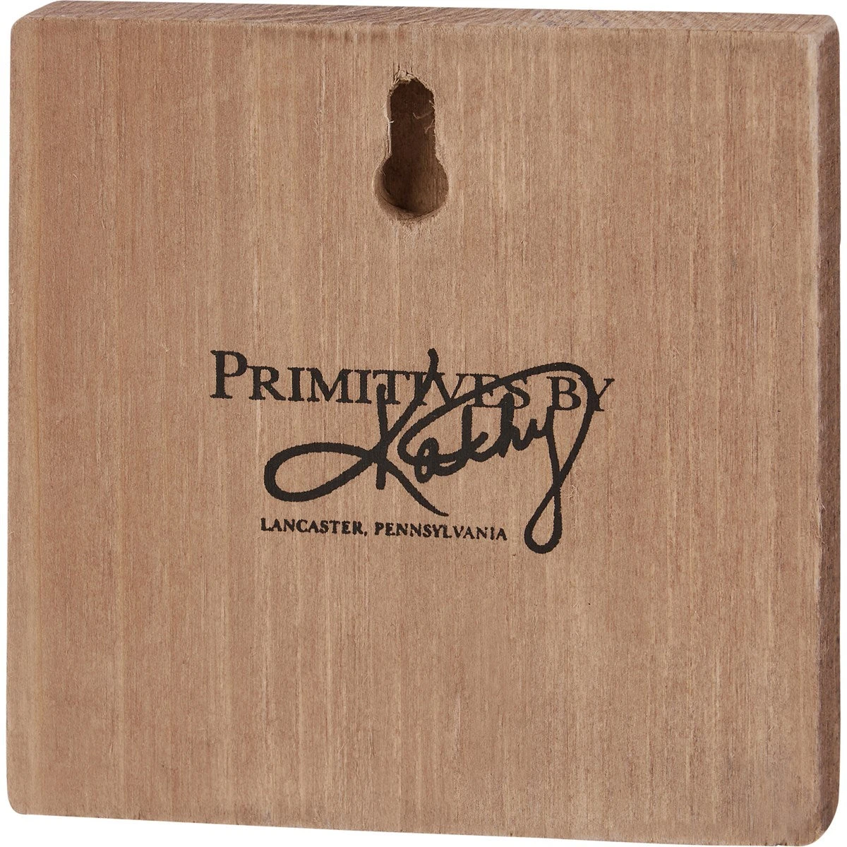 A wooden block sign displaying a chipmunk with snowy woodland background and natural stained wood sides. Design is replicated from original artwork painted onto burlap canvas, giving the art a unique depth and texture. The chipmunk block sign is easy to hang via predrilled keyhole slot or can free-stand alone.