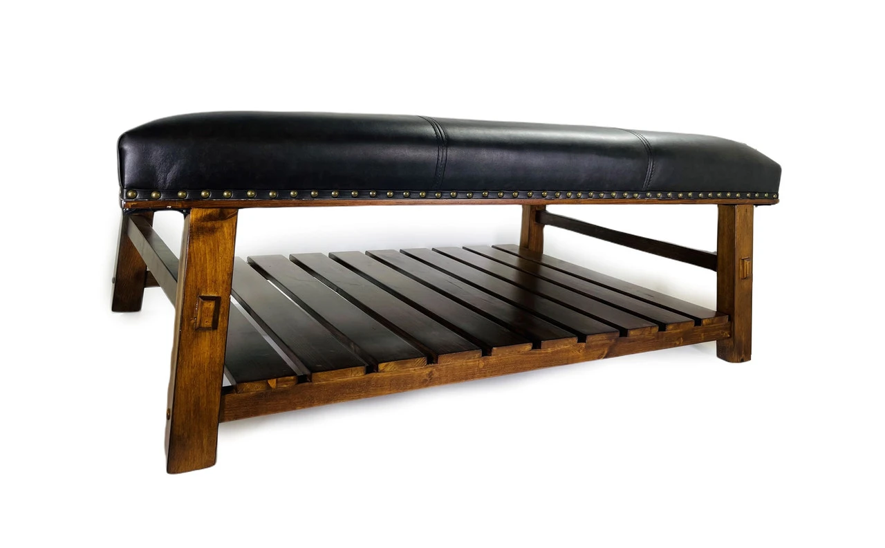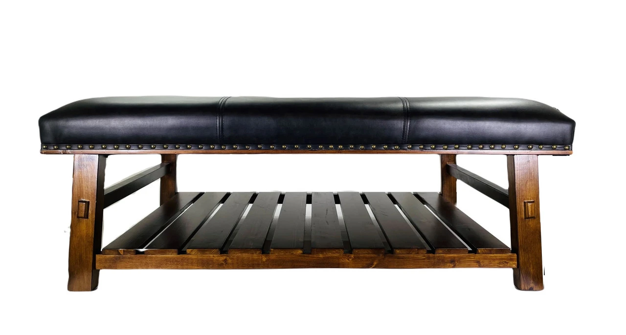 This Mission style bench has a rich medium brown stain with plank construction for excellent strength and durability. Saddle stitch detailing on faux leather top with antiqued brass nail head trim adds additional style. Â