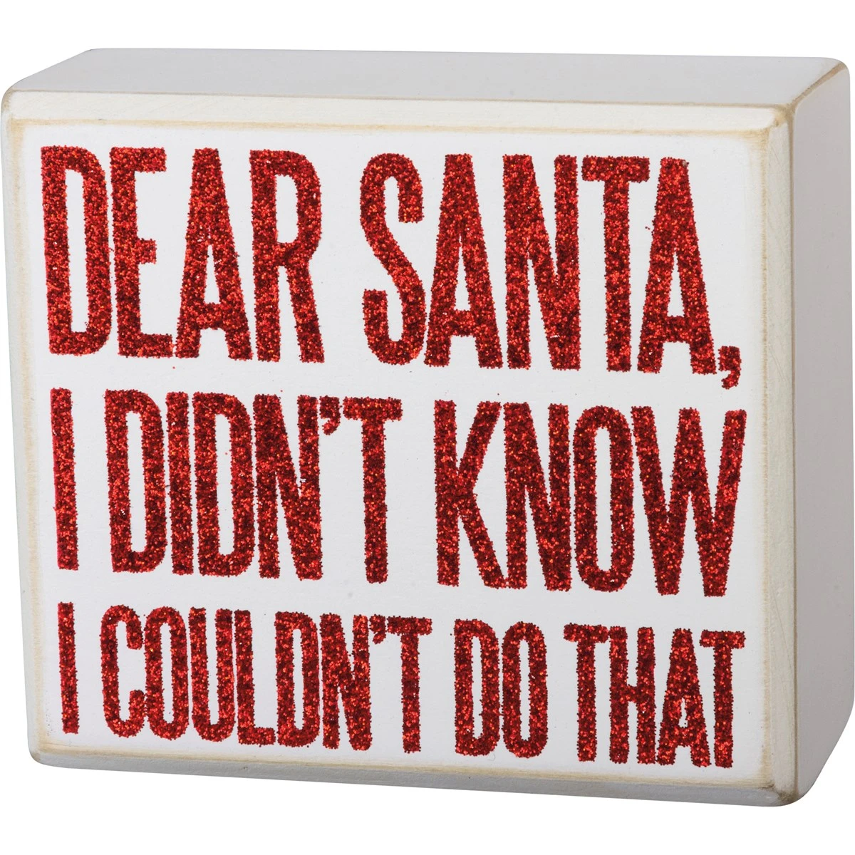 A white wooden box sign featuring a “Dear Santa, I Didn’t Know I Couldn’t Do That” sentiment in red glitter details. Easy to hang or can free-stand alone.