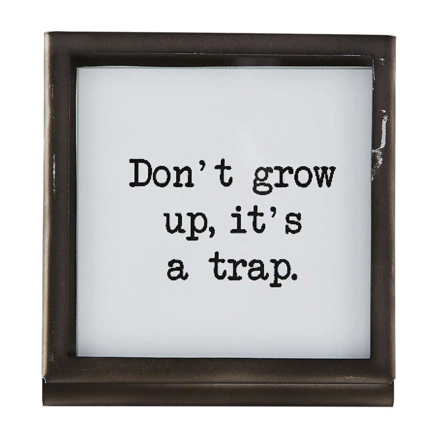 This It’s a Trap Metal Sign is sure to have all your guests laughing. The printed sentiment is set in a metal framed plaque. The frame features a white background with the saying “Don’t grow up, it’s a trap” in the center of the frame. This can also be used as a picture frame.