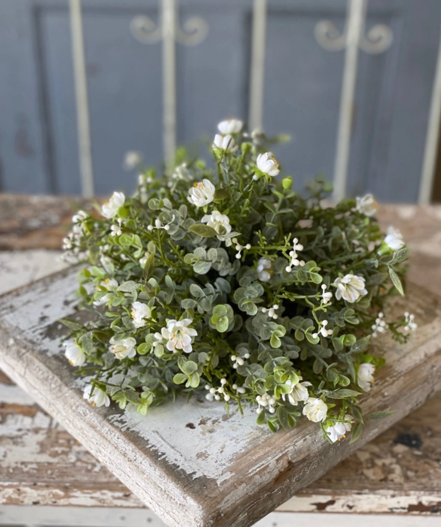 This collection features mixed greenery interspersed with dainty white blooms and small orbs. Creates a delicate and timeless feel.