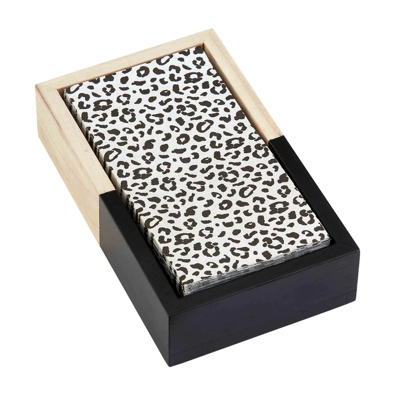 You’ll love the purrfect design of this Black and Tan Guest Towel Box Set. The two piece set comes with a pack of 12 paper guest towels. The guest towels feature a tan and black leopard print pattern. The guest towel set comes in a hand-painted paulownia wood display box.