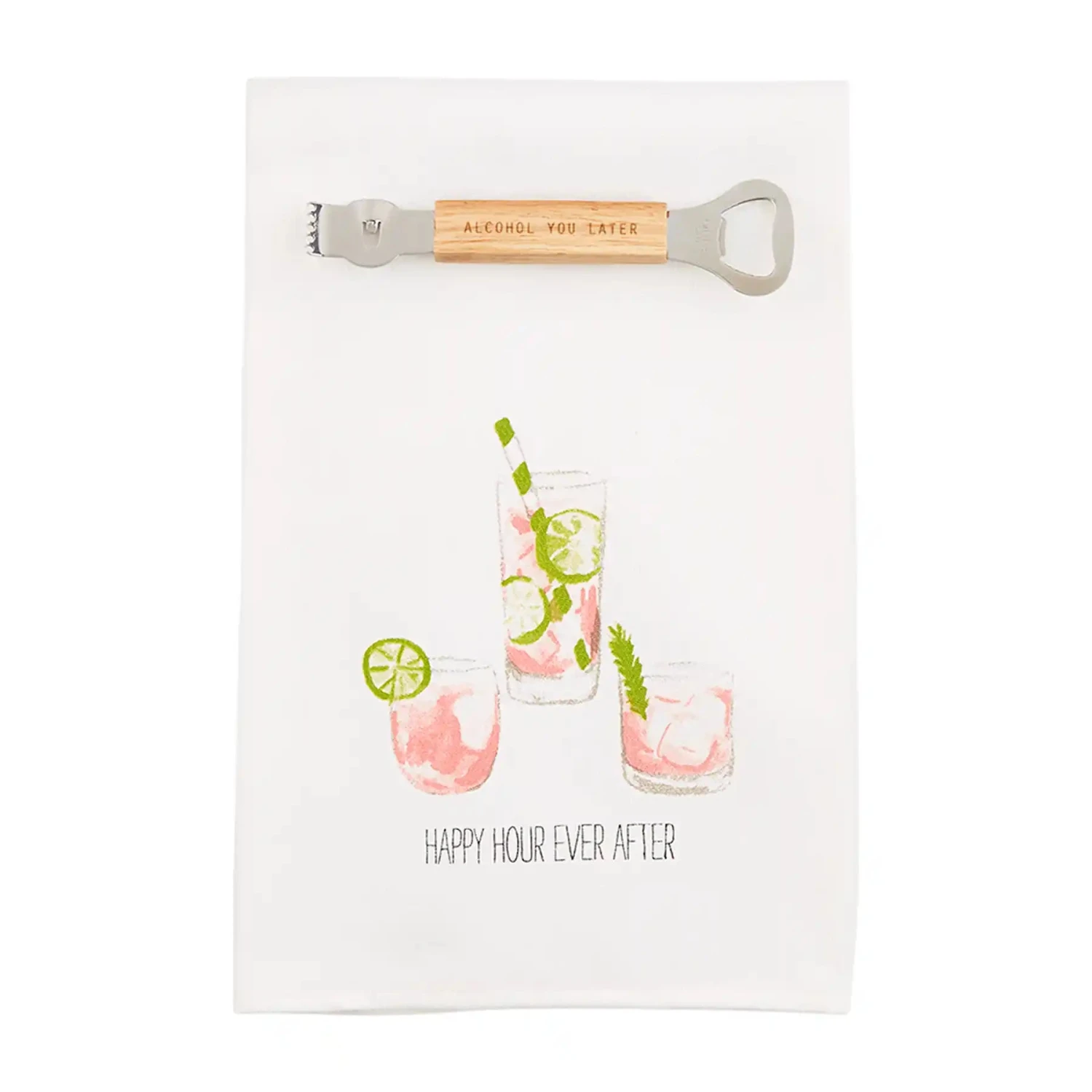 Celebrate Happy Hour Ever After with this happy hour hand towel set. The printed cotton hand towel features various liquor glasses with the printed sentiment “Happy Hour Ever After”. The set arrives with a double-sided metal bar tool with etched wood handle that features the phrasing “Alcohol You Later”.