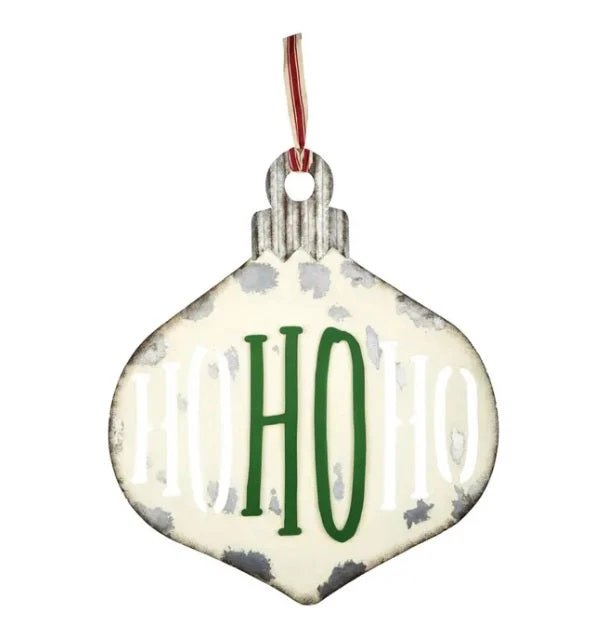 Enhance your curb appeal with this HoHo Ho Ornament Door Hanger. The ornament door hanger is made of laser-cut tin metal. The hanger will feature unique markings and hangs with a festive ribbon.