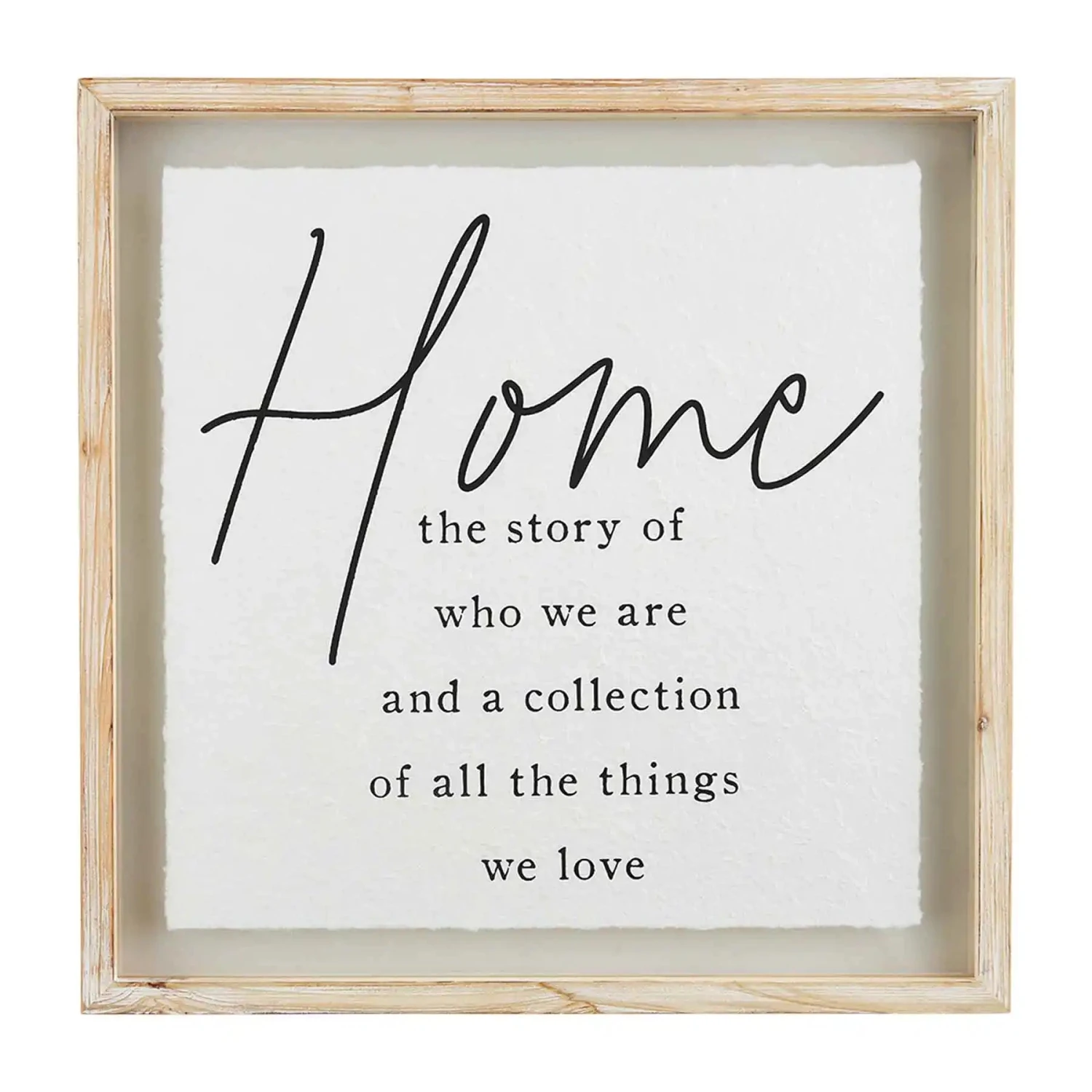 You’re home! Enjoy it with our Home Glass Wall Plaque. The wooden frame features pressed glass panes. The panes hold a sentiment parchment paper. The sentiment reads “Home – the story of who we are and a collection of all the things we love”. Sign comes with sawtooth hardware.