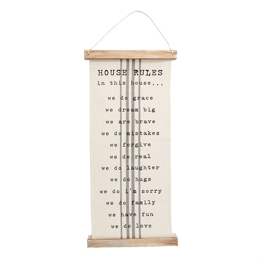 Printed sentiment woven cotton hanger features mango wood weights and cotton rope loop hanger.