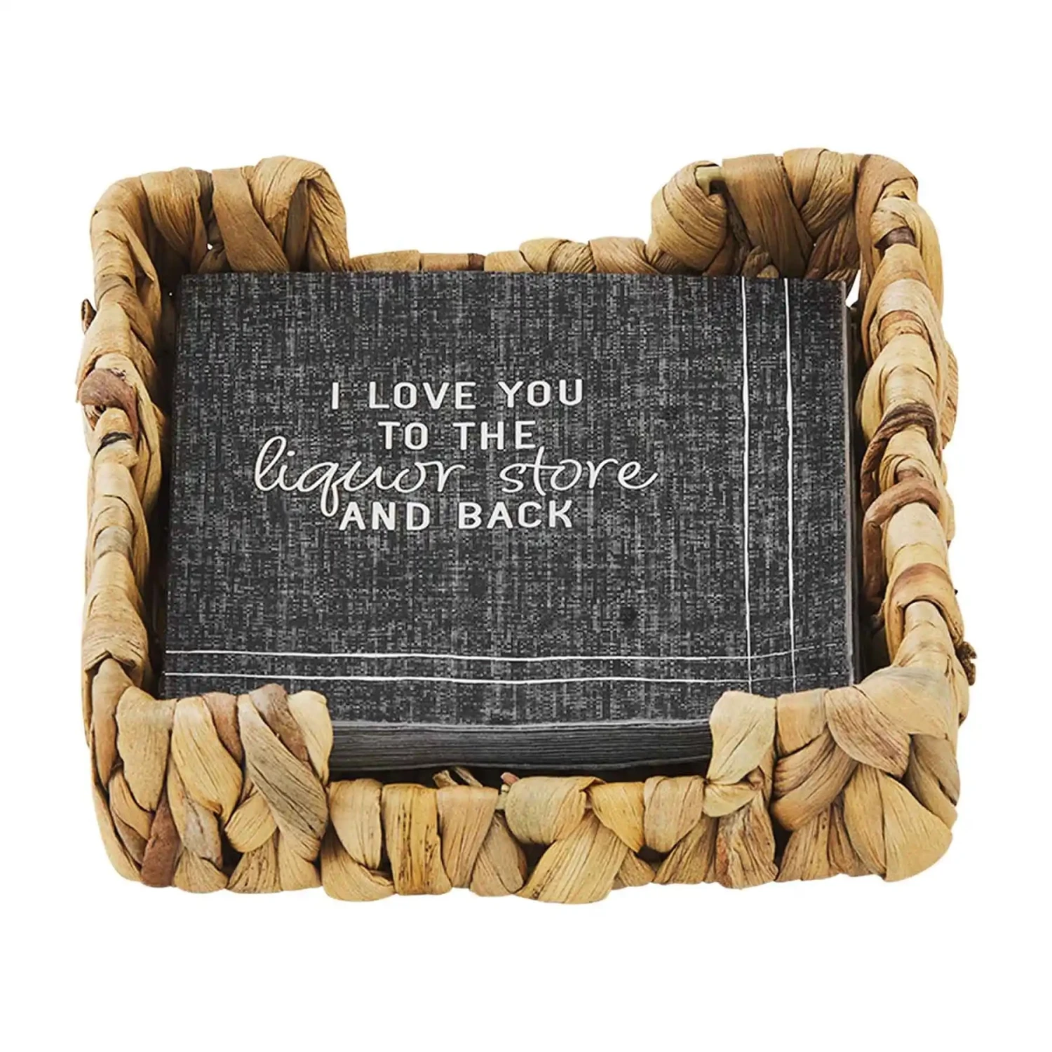 You’ll love this Liquor Store Cocktail Napkin Set to the liquor store and back! The pack comes with 12 paper cocktail napkins. The napkins come in square water hyacinth basket. The cocktail napkins read “I love you to the liquor store and back” in the center. The napkins feature black and white coloring.