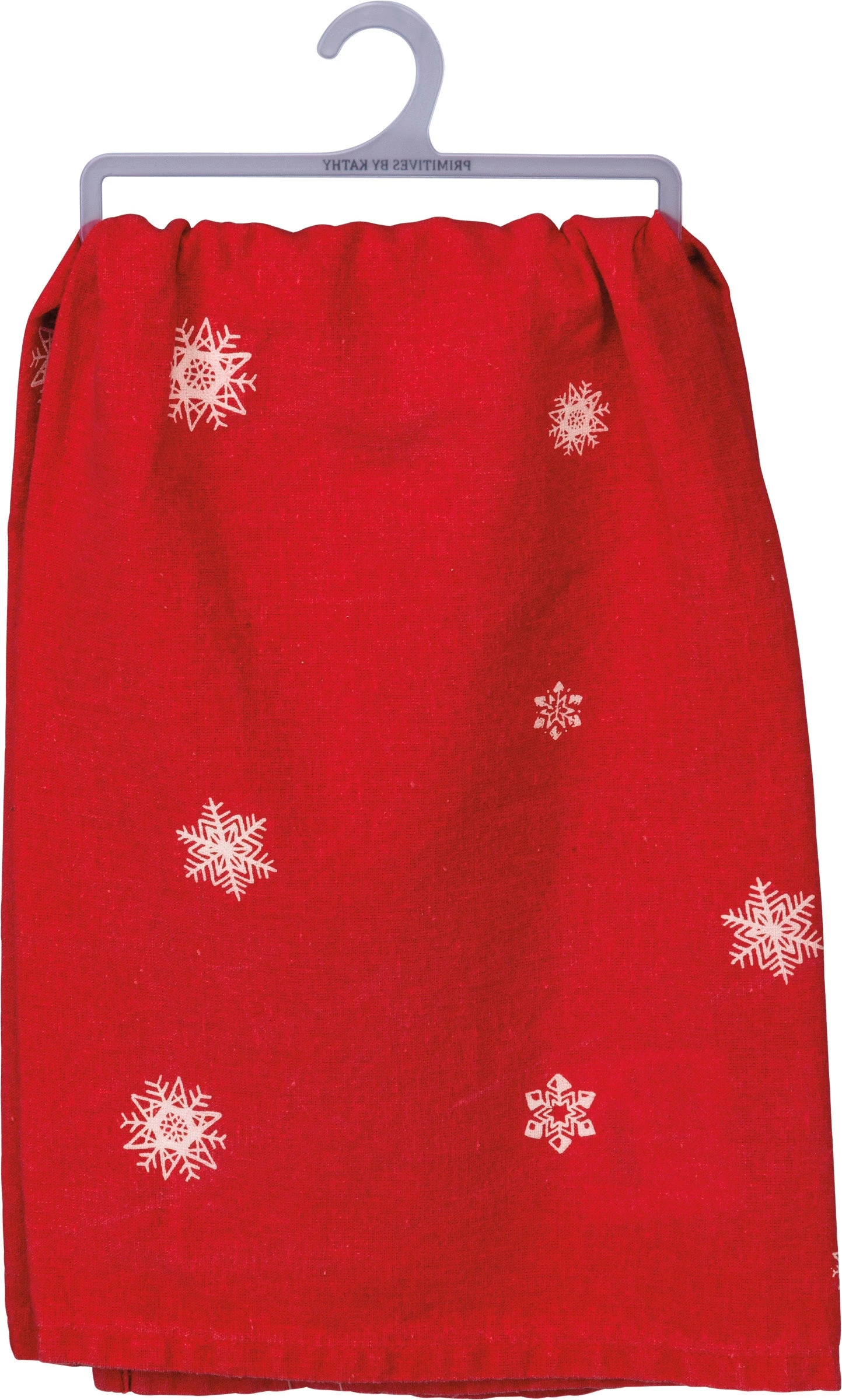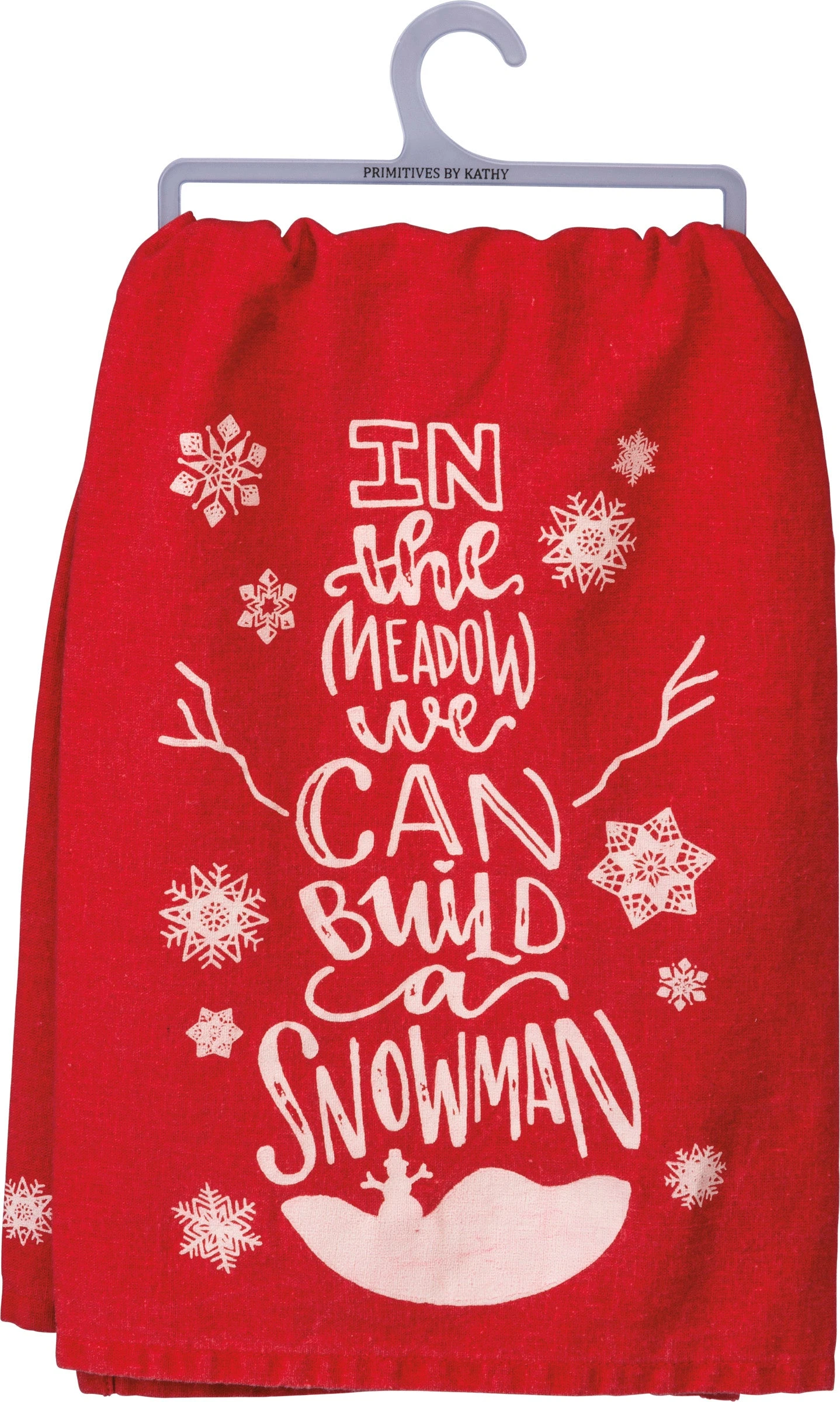A red and white cotton kitchen towel featuring a “In The Meadow We Can Build A Snowman” sentiment with snowman and snowflake illustrations throughout for a charming kitchen accessory. Machine-washable.