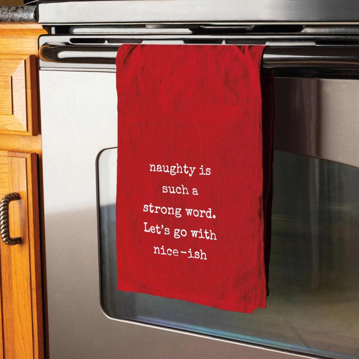 A red cotton kitchen towel featuring a typeset “Naughty Is Such A Strong Word. Let’s Go With Nice-ish” sentiment. Our Nice-ish kitchen towel is machine-washable.