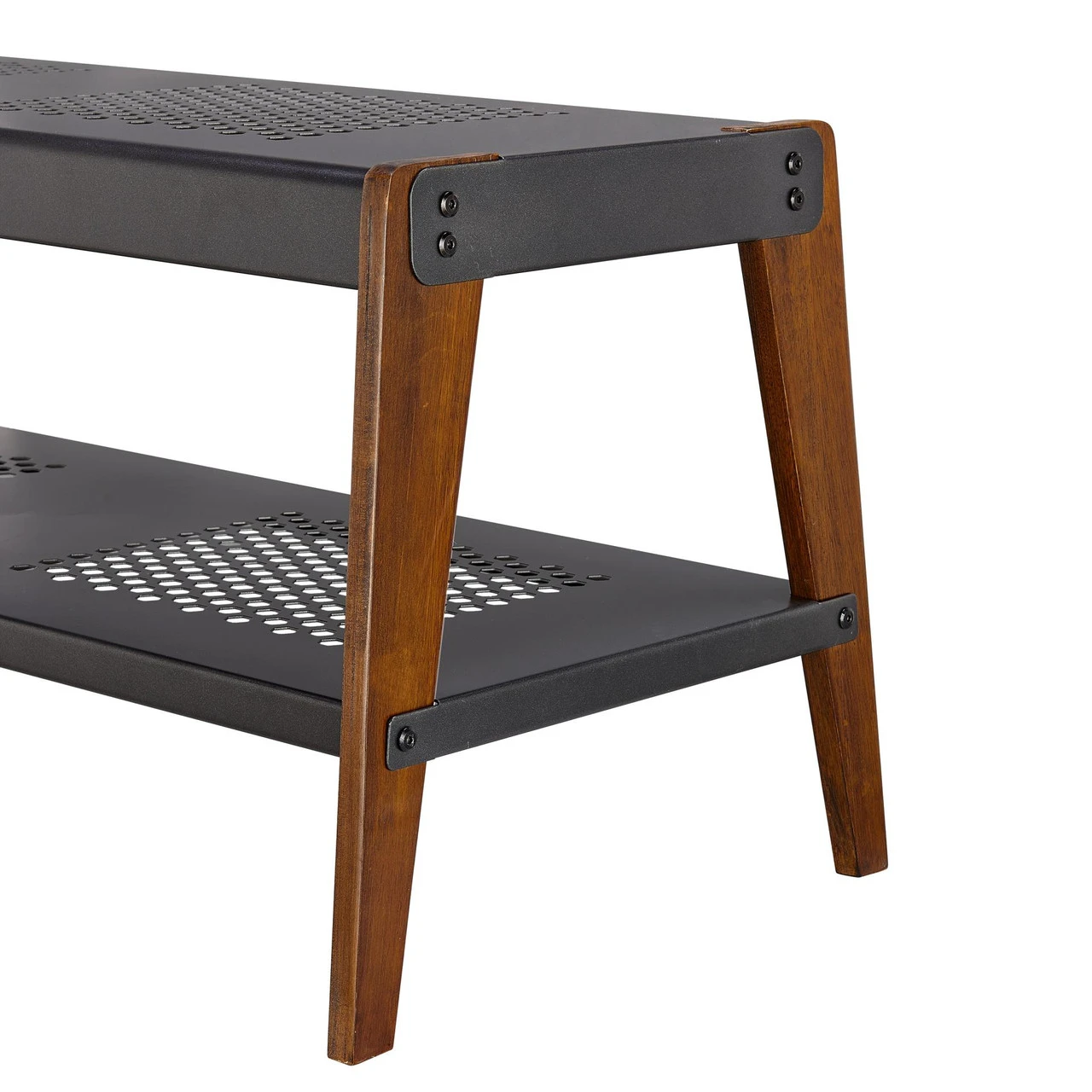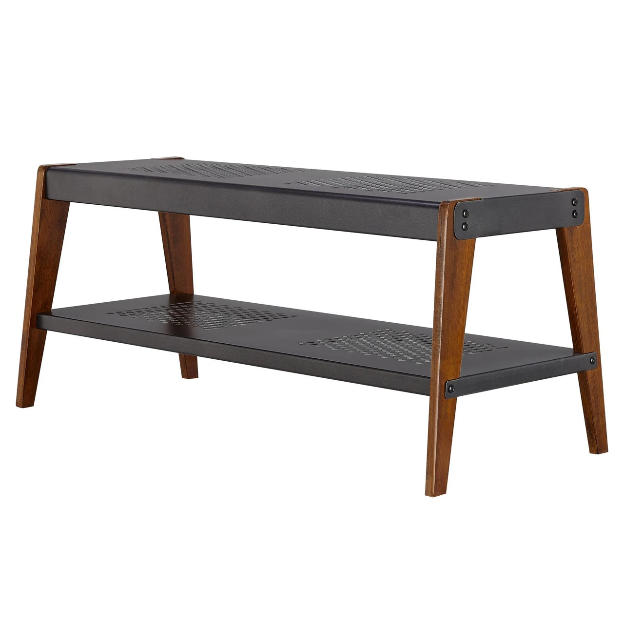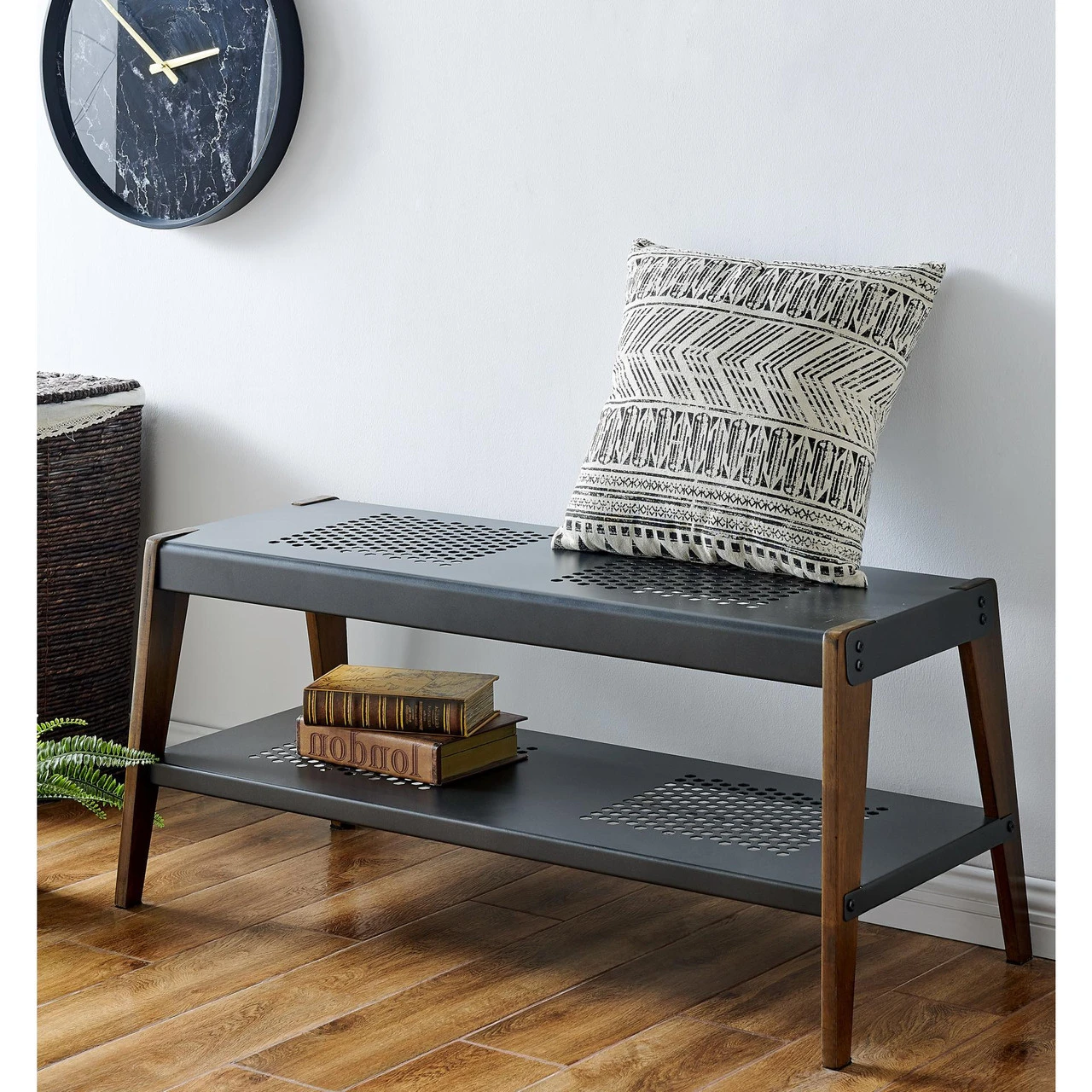 Modern with an Edgy Sophistication is the latest Novak collection. The 43.5″ width bench features perforated seat in sleek metallic gunmetal that’s constructed of powder coated steel, while Walnut finish Rubber wood frames around its square profile. Modern style stretcher design for stability and sturdiness.