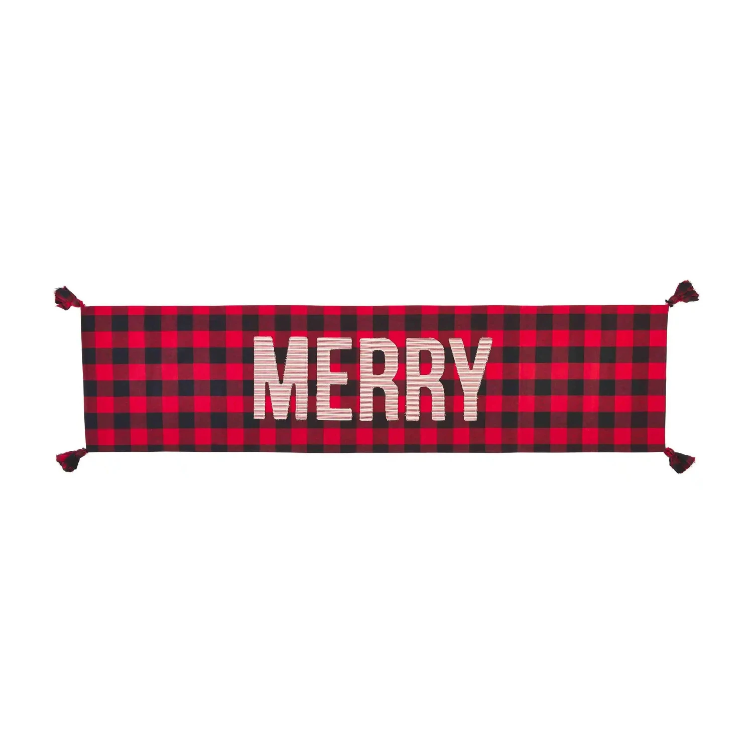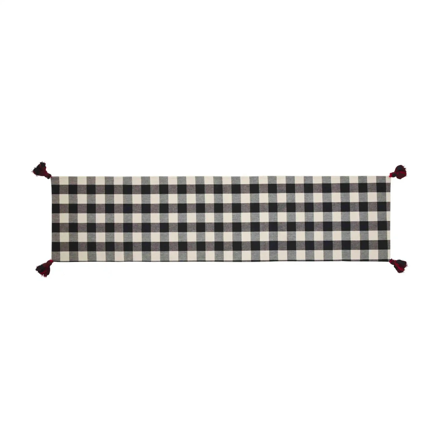 Say Merry Everything this Christmas season with our Merry Buffalo Check Table Runner. The reversible appliqued cotton table runner features corner tassels. One side of the runner features a black and red plaid pattern. The other side features a black and white plaid pattern.