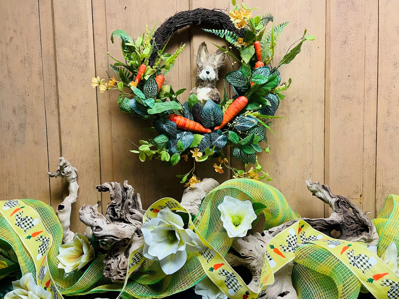 Celebrate Spring with this delightful gingham bunny ribbon. Checked bunny design in black and white alternate between orange carrots on a cheerful yellow background. The linen weave ribbon has wired, stitched edges in matching yellow thread for body and ease of use. Wonderful to add to your or indoor or outdoor decor and sure to make everyone smile. Â