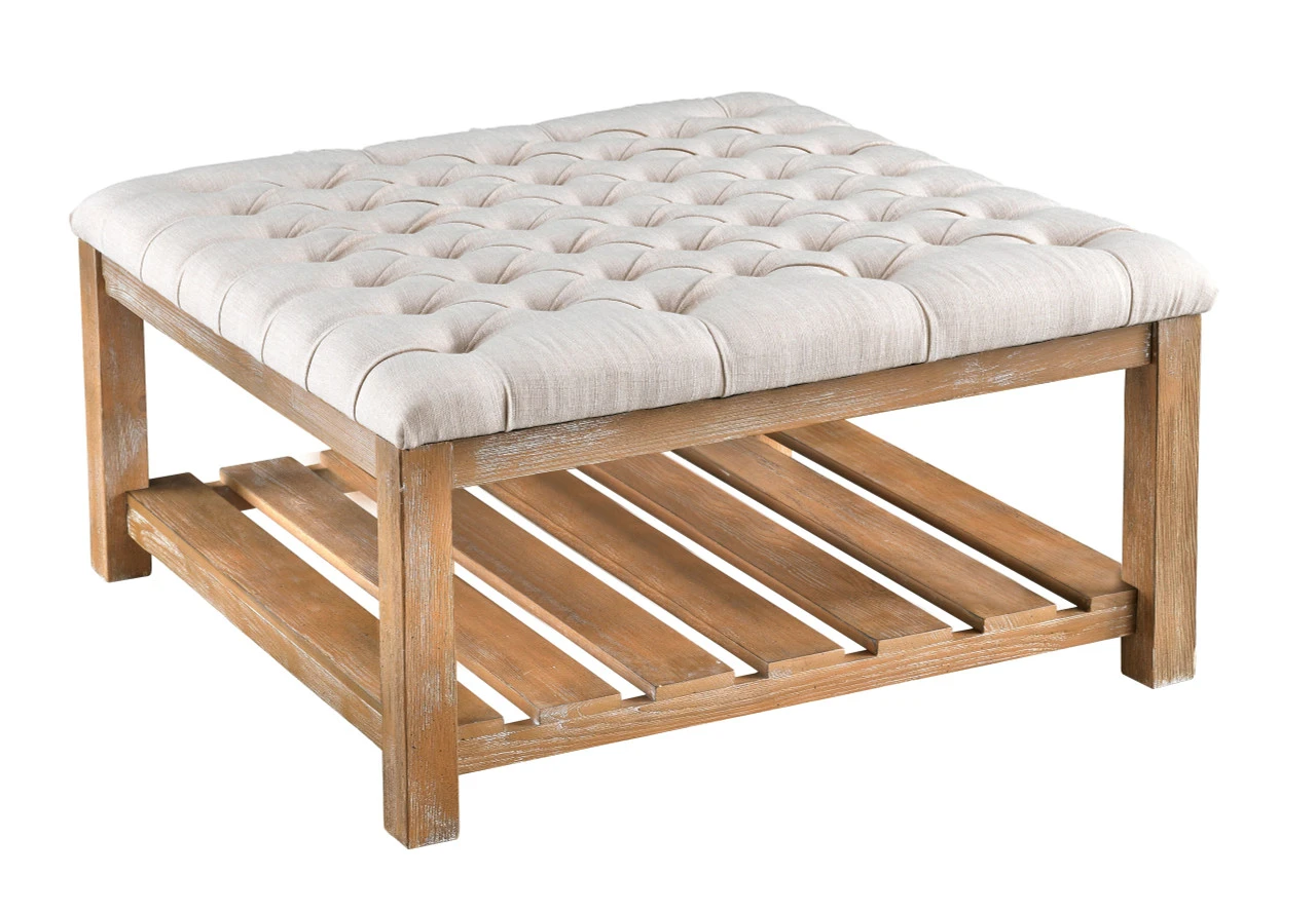 This square tufted ottoman has a natural distressed finish with limewash highlights blending well with the linen weave upholstery. The slat shelf below gives additional storage and display space keeping the overall look light and casual but extremely functional.