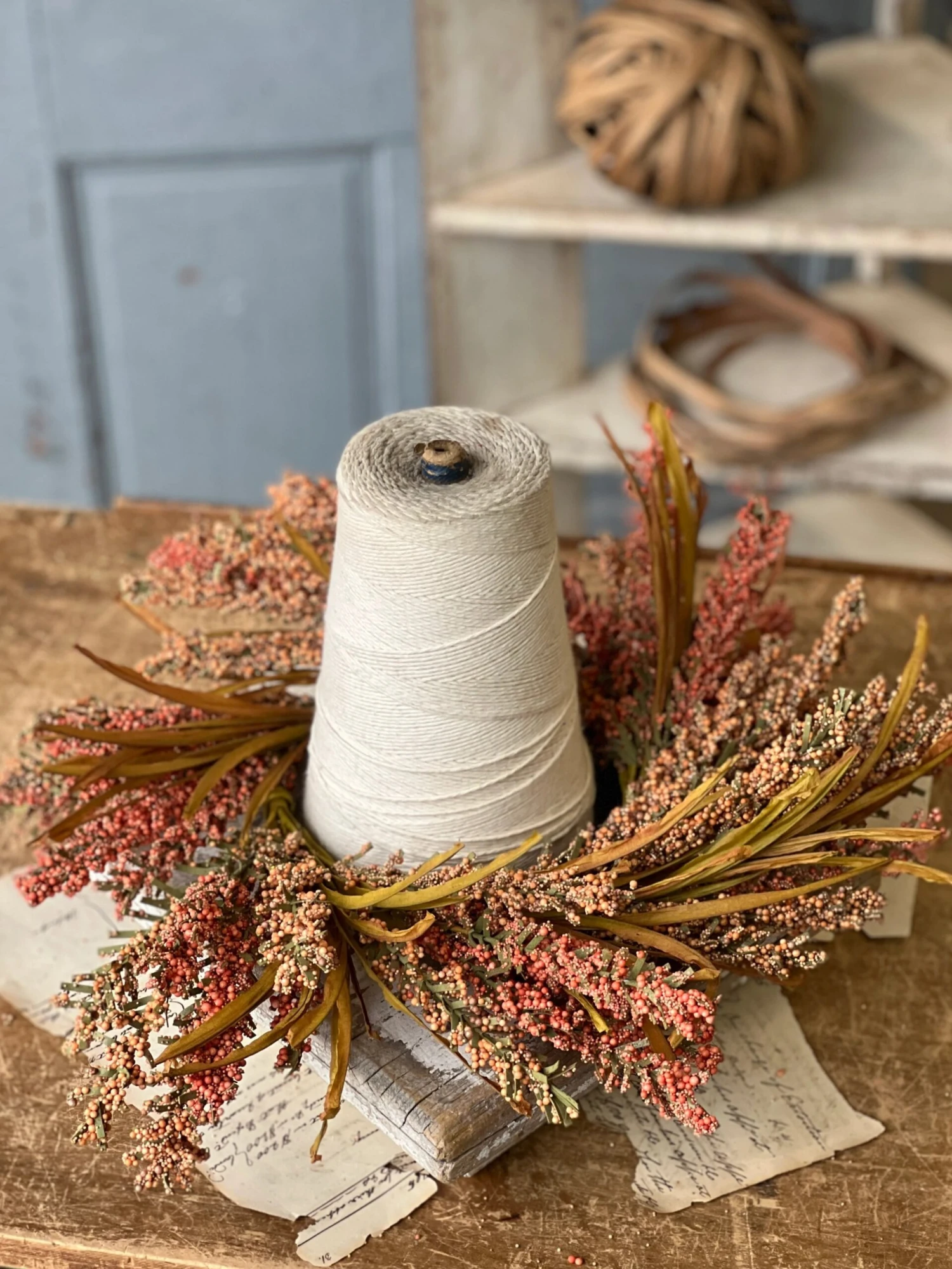 A collection that is rich intexture and sure to garner attention! Millet like spires composed of bubble berries make a bold statement and are beautifully accented with whisp like paper elements.