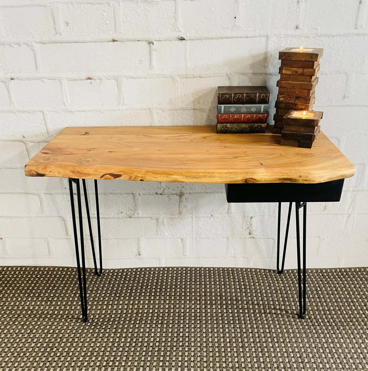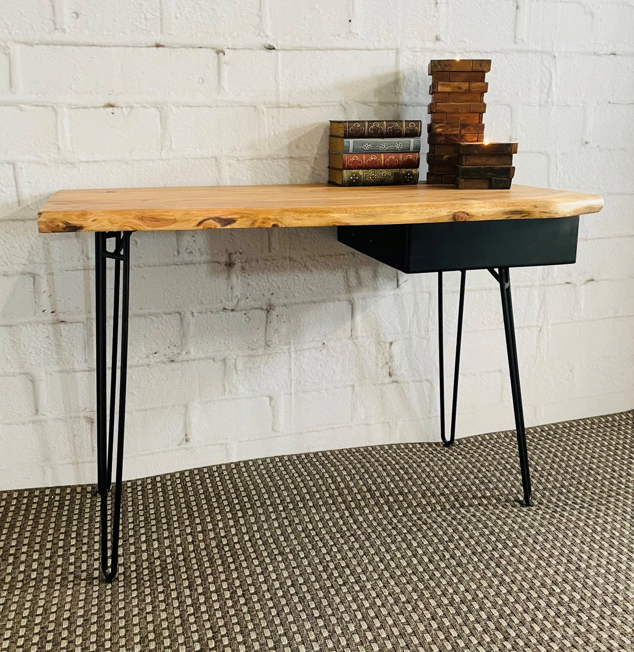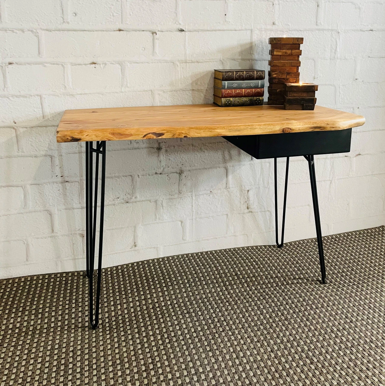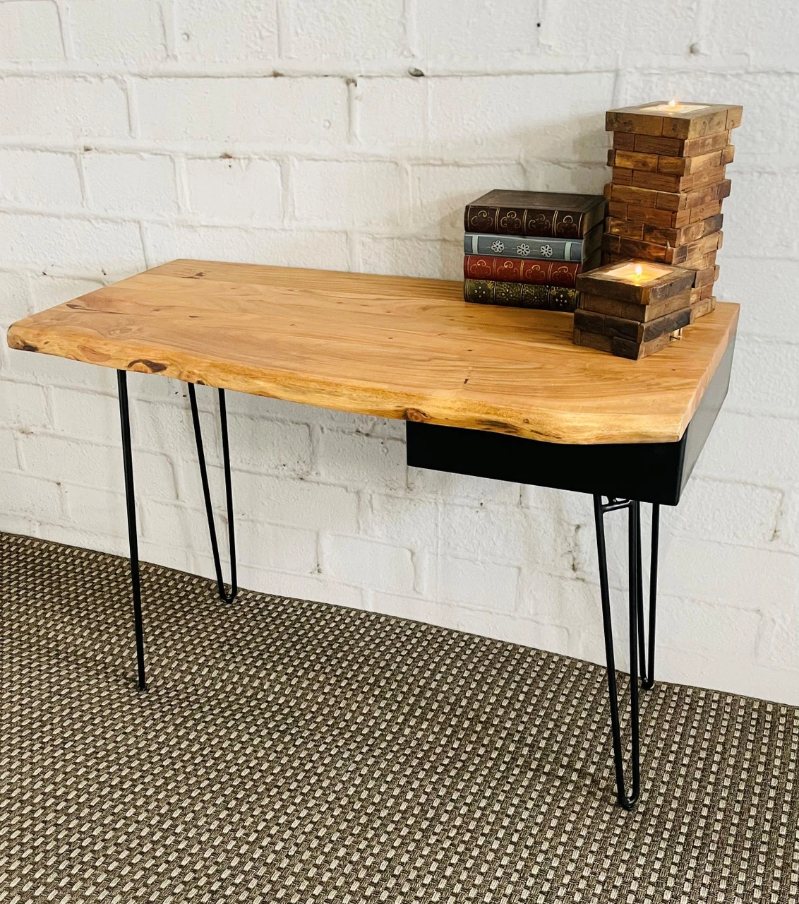 Live Edge Mid-Century inspired Writing Desk with Hair-Pin Legs and 1 side drawer.